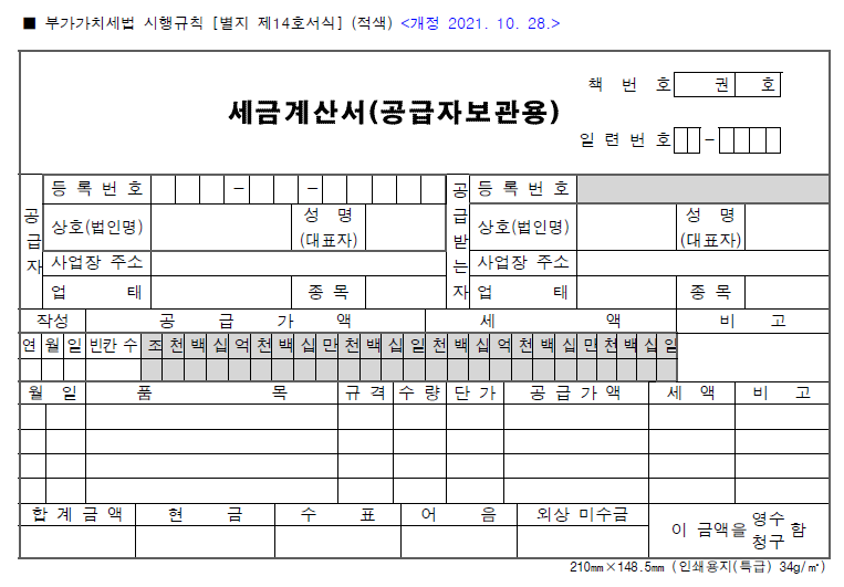 부가가치세법 시행규칙에는 공급자고보관용과 공급받는자 보관용 세금계산서의 예시를 제시하고 있다.